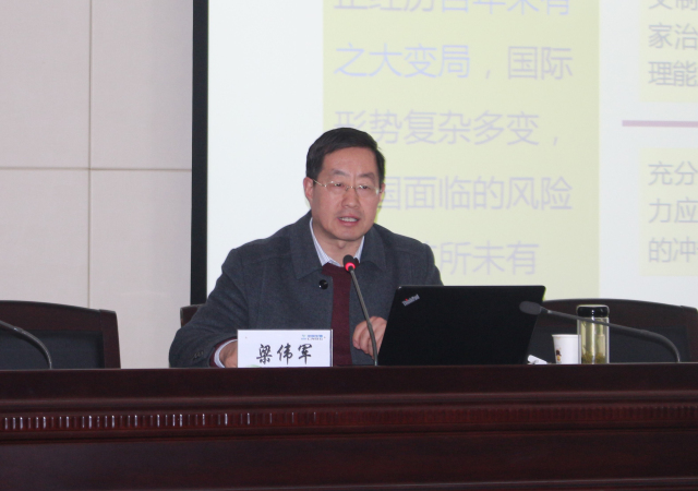 報告會上,梁偉軍同志以《筑牢制度根基 實現(xiàn)偉大夢想》為題,對黨的十九屆四中全會的時代背景、重要意義進行了解析,系統(tǒng)闡述了堅持和完善中國特色社會主義制度、推進國家治理體系和治理能力現(xiàn)代化的重大意義、總體要求、總體目標和重點任務等內(nèi)容,從歷史和實踐的維度,用具體的數(shù)據(jù)和案例為與會人員帶來了一場生動、全面、精彩的報告。