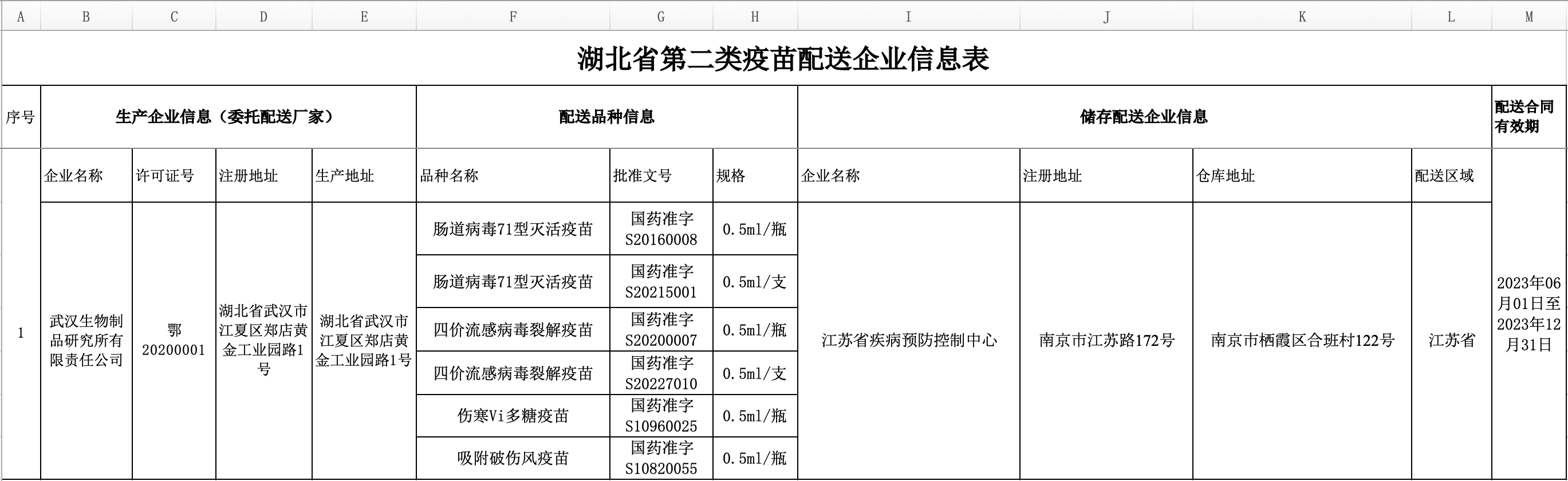 湖北省第二類疫苗配送企業(yè)信息表(武漢生物制品研究所有限責(zé)任公司)