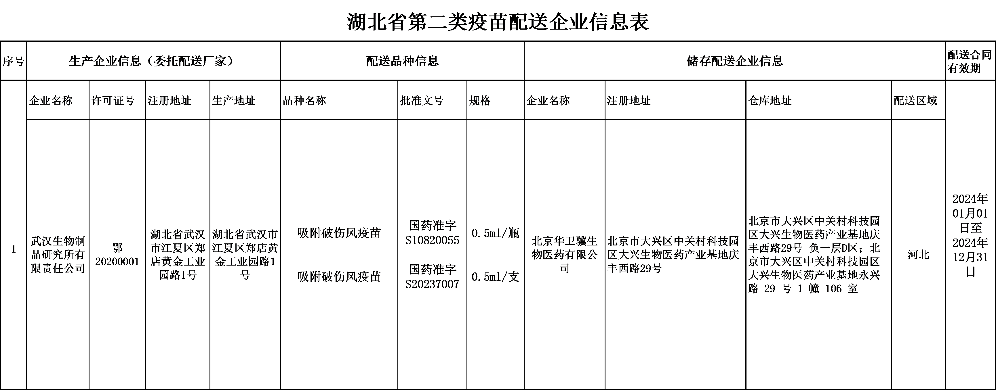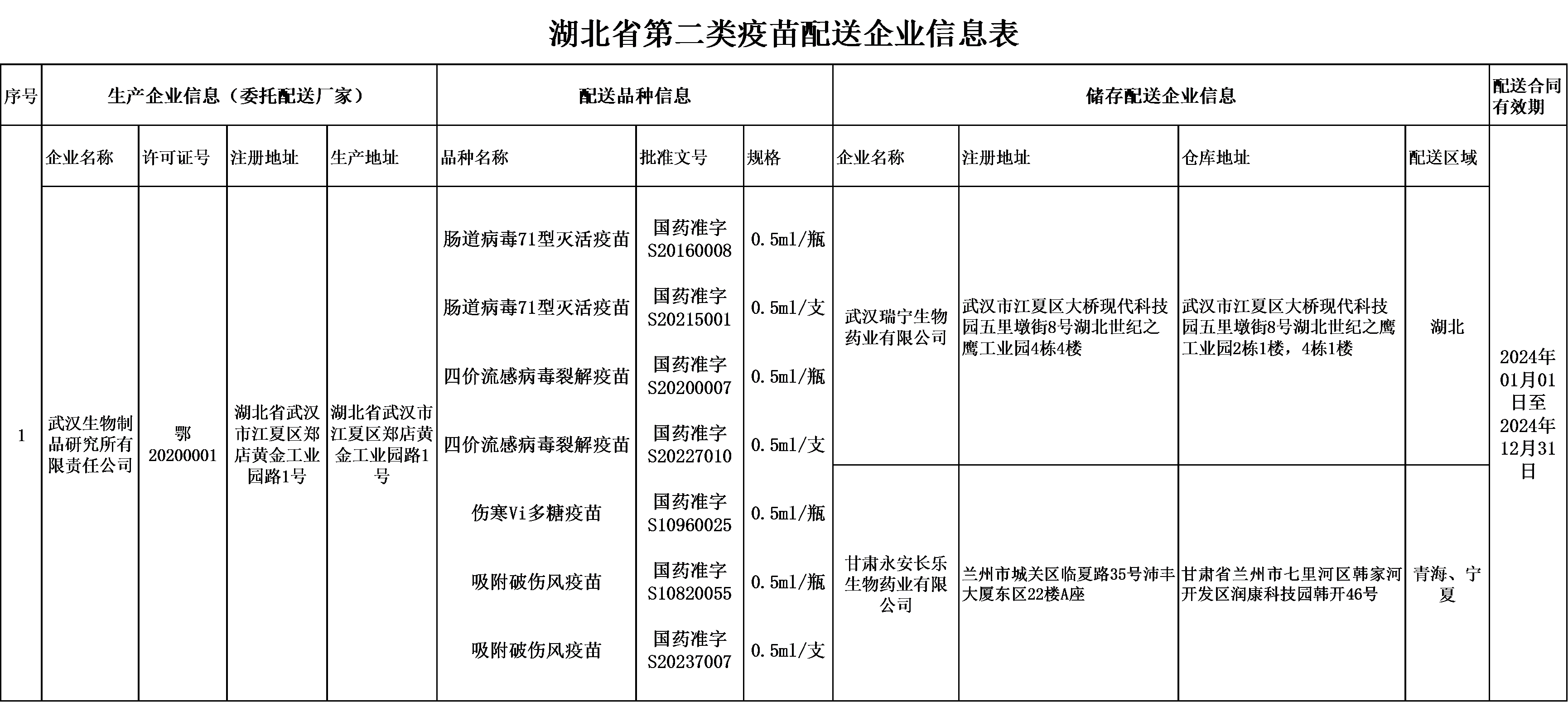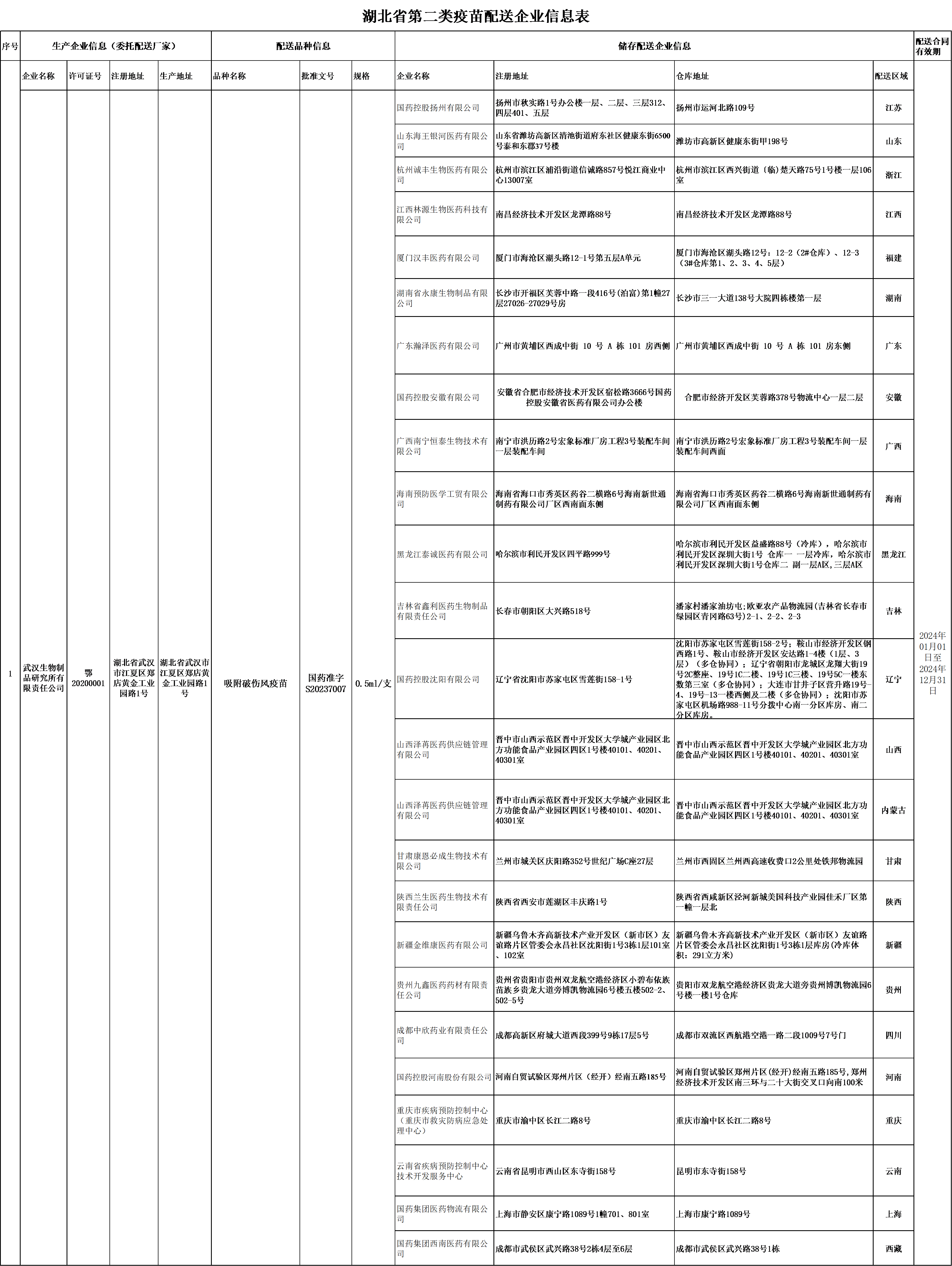 湖北省第二類疫苗配送企業(yè)信息表(武漢生物制品研究所有限責(zé)任公司)